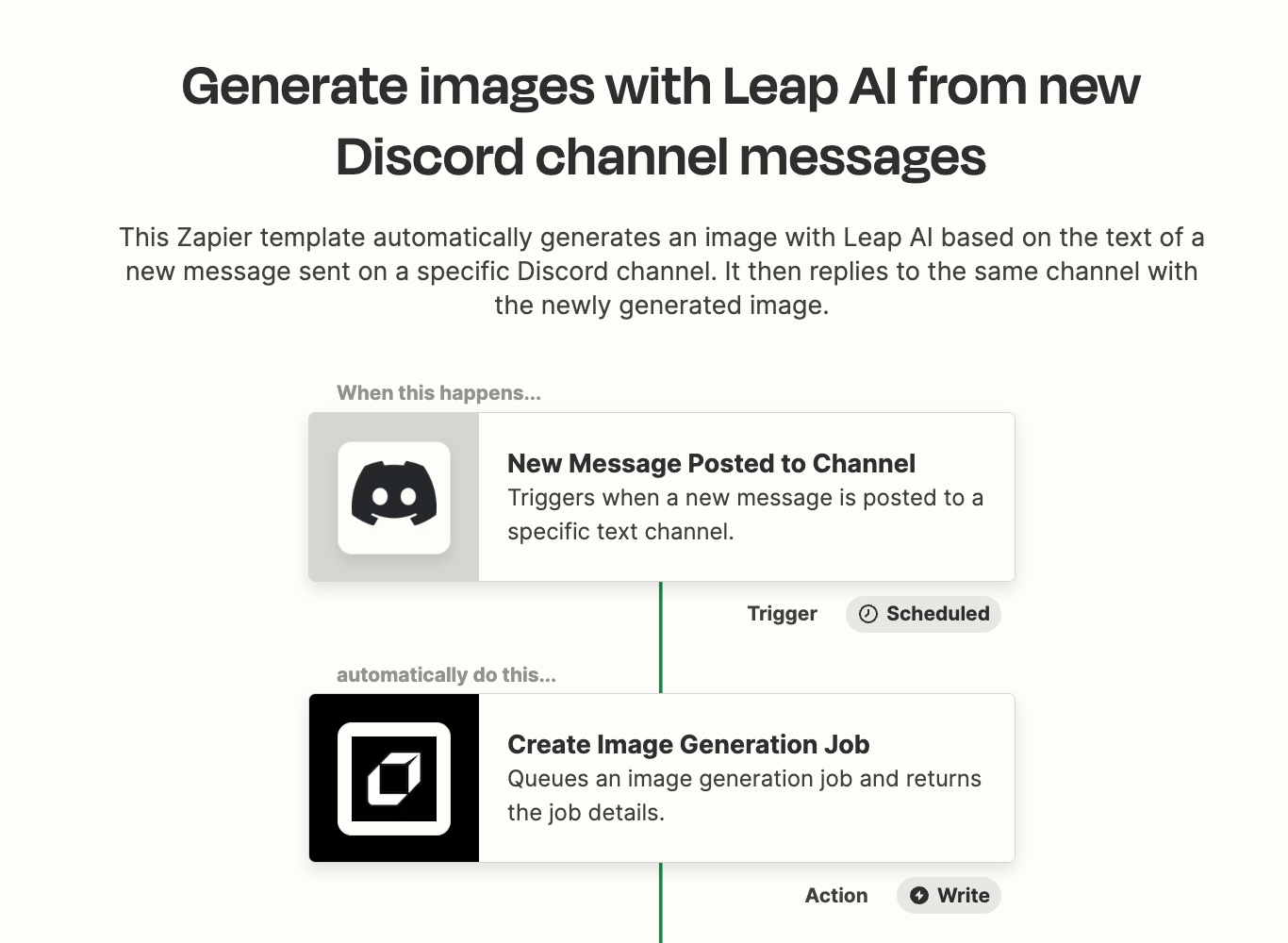 Thanks to platforms like Zapier, integrating Leap AI with Discord is a breeze. A specific Zapier template has been designed to automatically generate an image with Leap AI based on the text of a new message sent on a specific Discord channel. Once the image is generated, it's automatically posted back to the same channel. This seamless integration ensures that users can visualize their text messages in the form of high-quality images without leaving their Discord environment.
